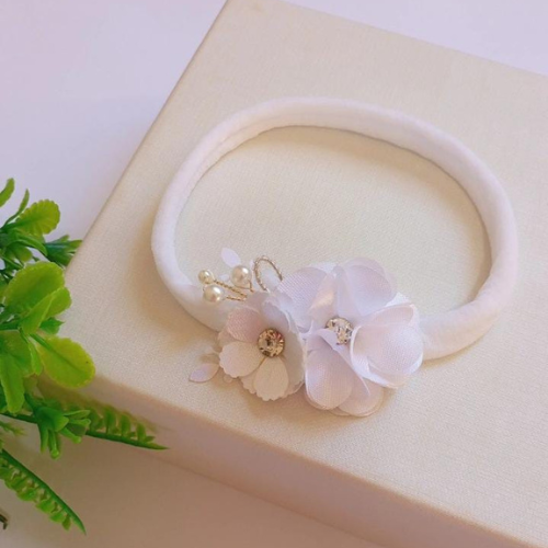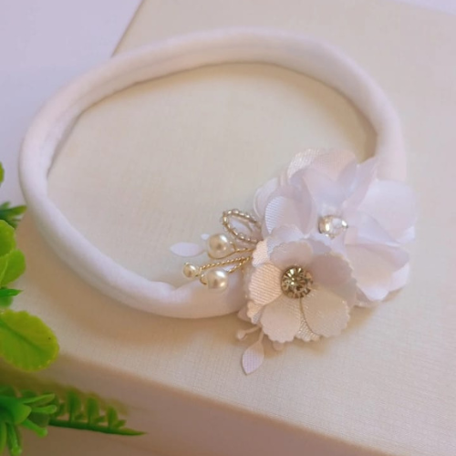 Detalhe em arrumado com pedrarias e flores de cetim.
