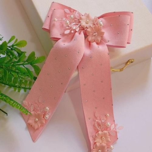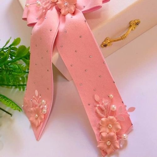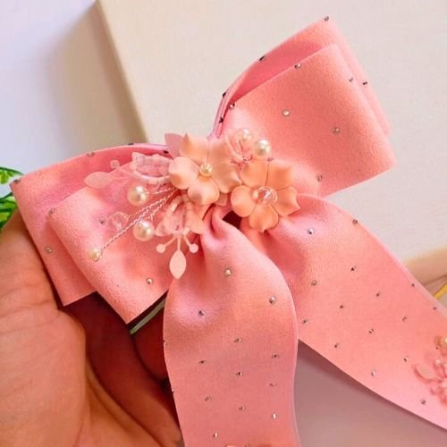 Fita aveludada , aplicaçoes em flores de porcelana fria e aramado com pedrarias .