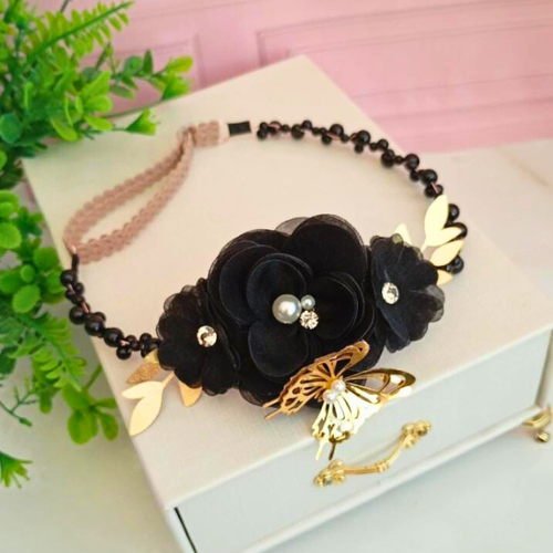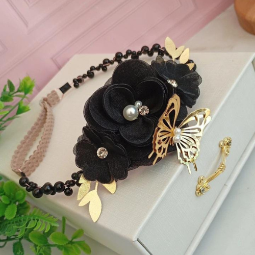 Flores de organza ,pedrarias e borboleta em Lonita ouro .